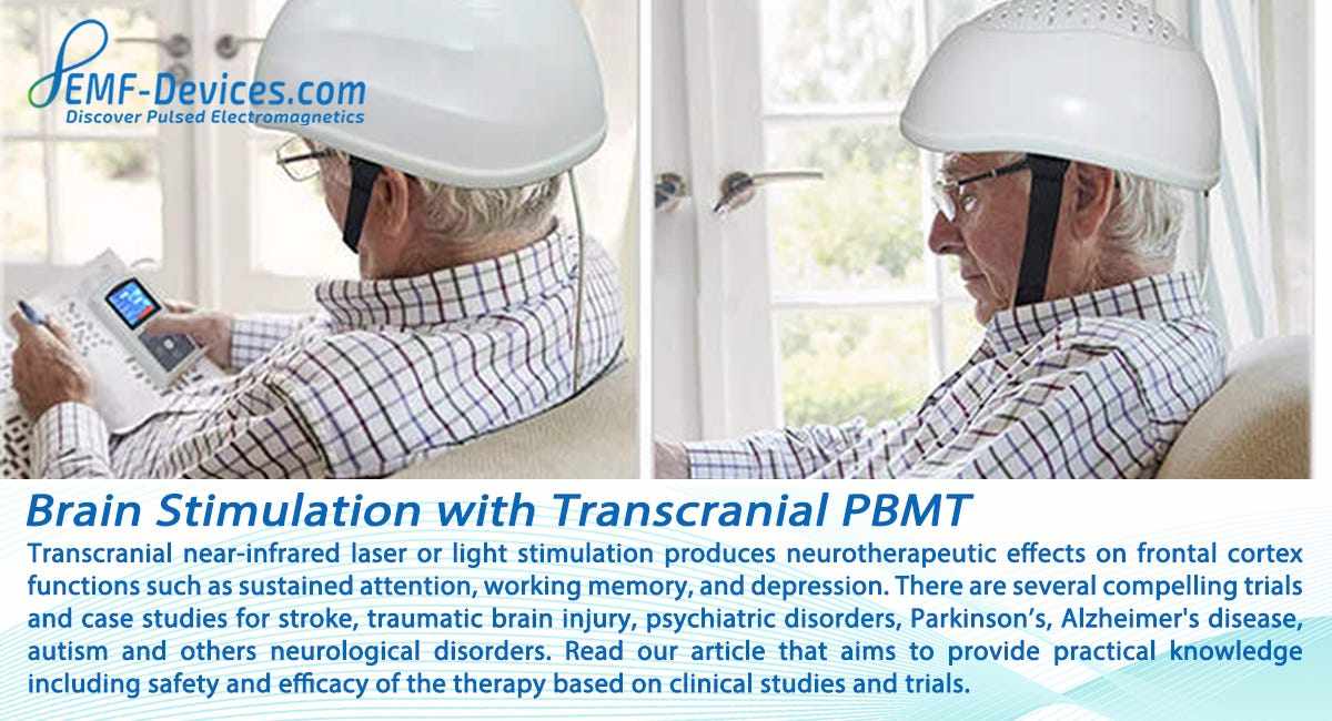 Transcranial PBMT (photobiomodulation therapy) applies low-level light for stimulating brain function and reducing inflammation. Transcranial near-infrared laser or light stimulation produces beneficial effects on frontal cortex functions such as sustained attention, working memory, and depression.
